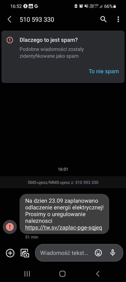 Kampania spamowa, z którą mogliście zetknąć się na swoich smartfonach, bazuje na prostym mechanizmie wzbudzania strachu w potencjalnych ofiarach, grożąc im odłączeniem energii elektrycznej. Wiadomość informuje, że wystarczy kliknąć w link, podać swoje dane i dokonać płatności, by rozwiązać problem. Brzmi prosto, prawda? Tyle tylko, że kliknięcie w link to najprostsza droga do utraty danych osobowych oraz pieniędzy!