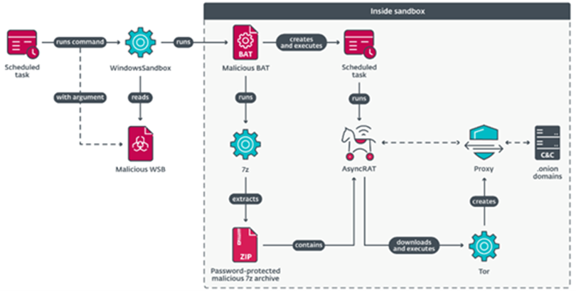 Dodatkowo, MirrorFace wdrożył mocno spersonalizowany, dostosowany pod konkretnego użytkownika wariant AsyncRAT, wykorzystując przy tym złożony mechanizm wykonania tego złośliwego oprogramowania w Windows Sandbox. Metoda ta miała na celu ukrycie złośliwego działania przed wykryciem.
