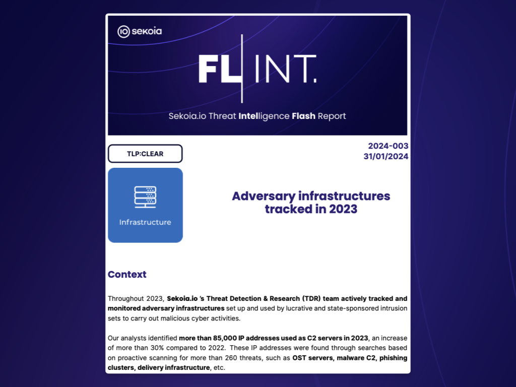 - Tworzenie prywatnych raportów wywiadowczych (FLINT – Sekoia FLash INTelligence), a także postów blogowych, aby dzielić się informacjami o pojawiających się zagrożeniach, nowych kampaniach ataków lub trendach, wzbogaconych o analizy techniczne i strategiczne.